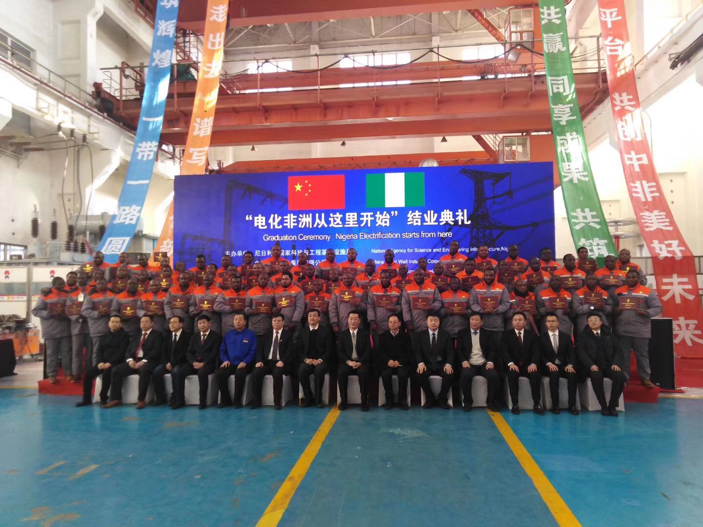 12月20日上午, “電化非洲從這里開始”尼日利亞學(xué)員培訓(xùn)結(jié)業(yè)典禮在集團(tuán)公司千山廠區(qū)變壓器裝配車間隆重舉行,這標(biāo)志首批學(xué)員圓滿完成項(xiàng)目前期學(xué)習(xí)培訓(xùn)即將載譽(yù)回國。鞍山市副市長高林、中國長城工業(yè)集團(tuán)有限公司副總裁張曉東、遼寧科技大學(xué)校長張志強(qiáng)及華冶集團(tuán)董事長馬黎明等出席了結(jié)業(yè)典禮。自今年年中尼日利亞項(xiàng)目正式啟動(dòng)后, 60名尼日利亞學(xué)員來到鞍山在我公司進(jìn)行EPC項(xiàng)目首期培訓(xùn)學(xué)習(xí),今天畢業(yè)的是首批32名學(xué)員,這批學(xué)員通過4個(gè)月的管理、技術(shù)、實(shí)操等全方位培訓(xùn),學(xué)員基本掌握了電工技術(shù)及變壓器工作基本原理及生產(chǎn)方法、工藝流程,回國后將繼續(xù)為項(xiàng)目的前期施工做準(zhǔn)備。